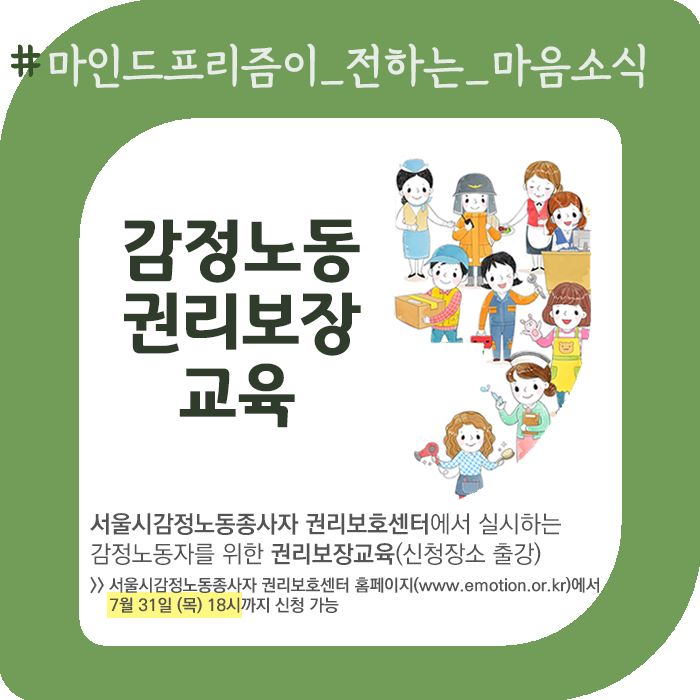 서울시감정노동종사자 권리보호센터 홈페이지(www.emotion.or.kr)에서 7월 31일 (목) 18시까지 신청 가능합니다 :)
