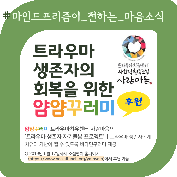 펀딩은 2019년 6월 17일까지 소셜펀치 홈페이지에서 진행되며,모금액은 트라우마 생존자들의 몸의 기능회복과 마음의 기초체력을 쌓기 위한, 치유의 기반이 되는 비타민꾸러미를 제공하는데 사용됩니다.