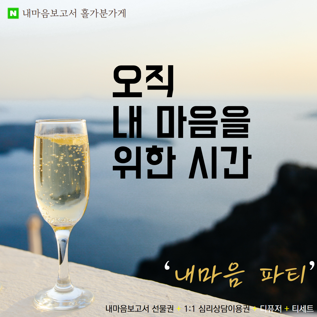 지금 네이버 [내마음보고서 홀가분가게]에서 내마음보고서, 1:1 상담, 내 마음을 달래줄 향기가득한 디퓨저와 티세트를 함께 만나보실 수 있습니다. 파격 할인가는 한정수량이니, 서둘러 주세요 : )
