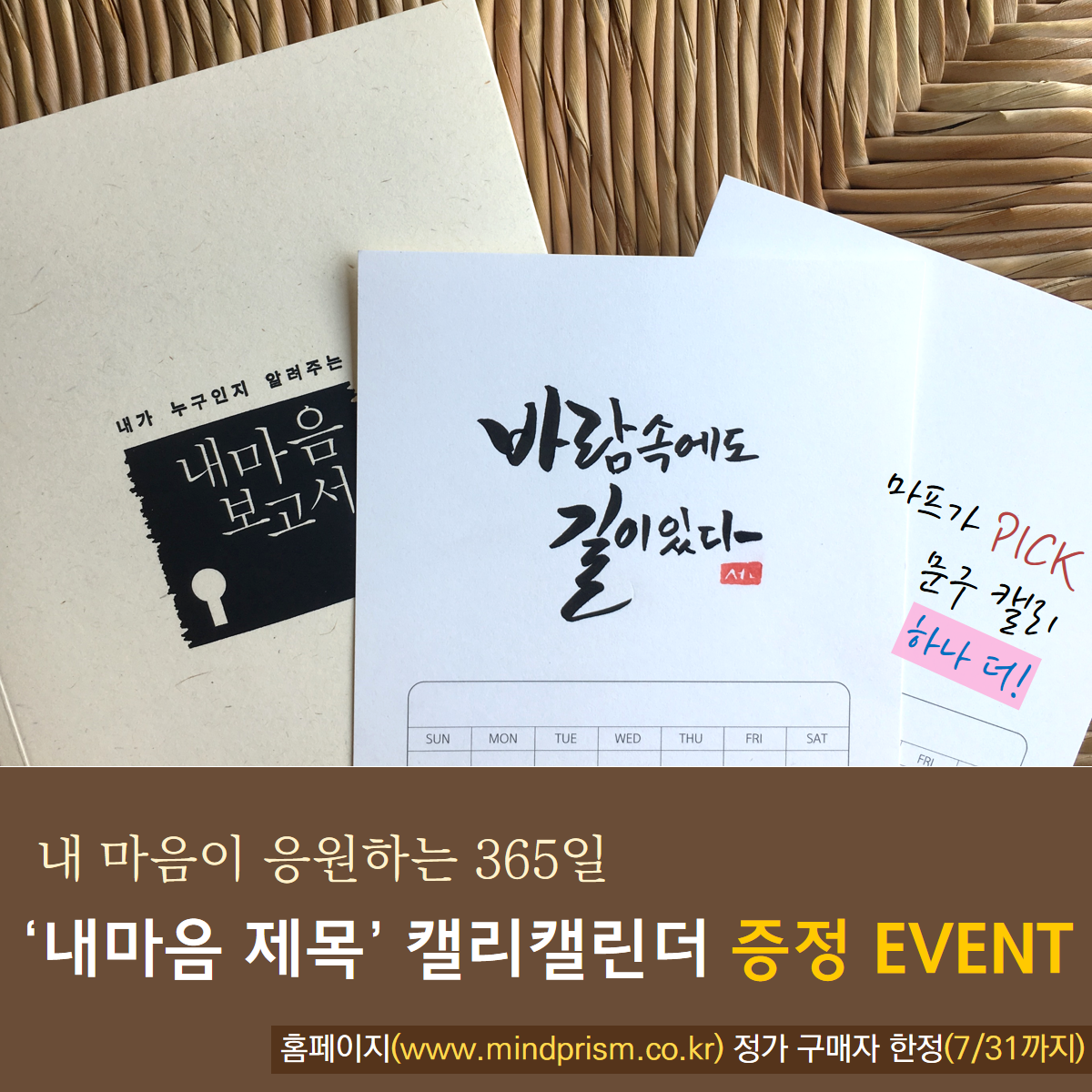 내마음제목 캘리캘린더 이벤트는 7월 31일(수)까지 진행되며, 기간 내 홈페이지에서 정가구매로 구입하여 검사를 모두 완료하신 분들께 한해 적용됩니다. 이벤트와 관련하여 구체적인 사항은 마인드프리즘 홈페이지 공지사항(www.mindprism.co.kr)을 참조해주세요.