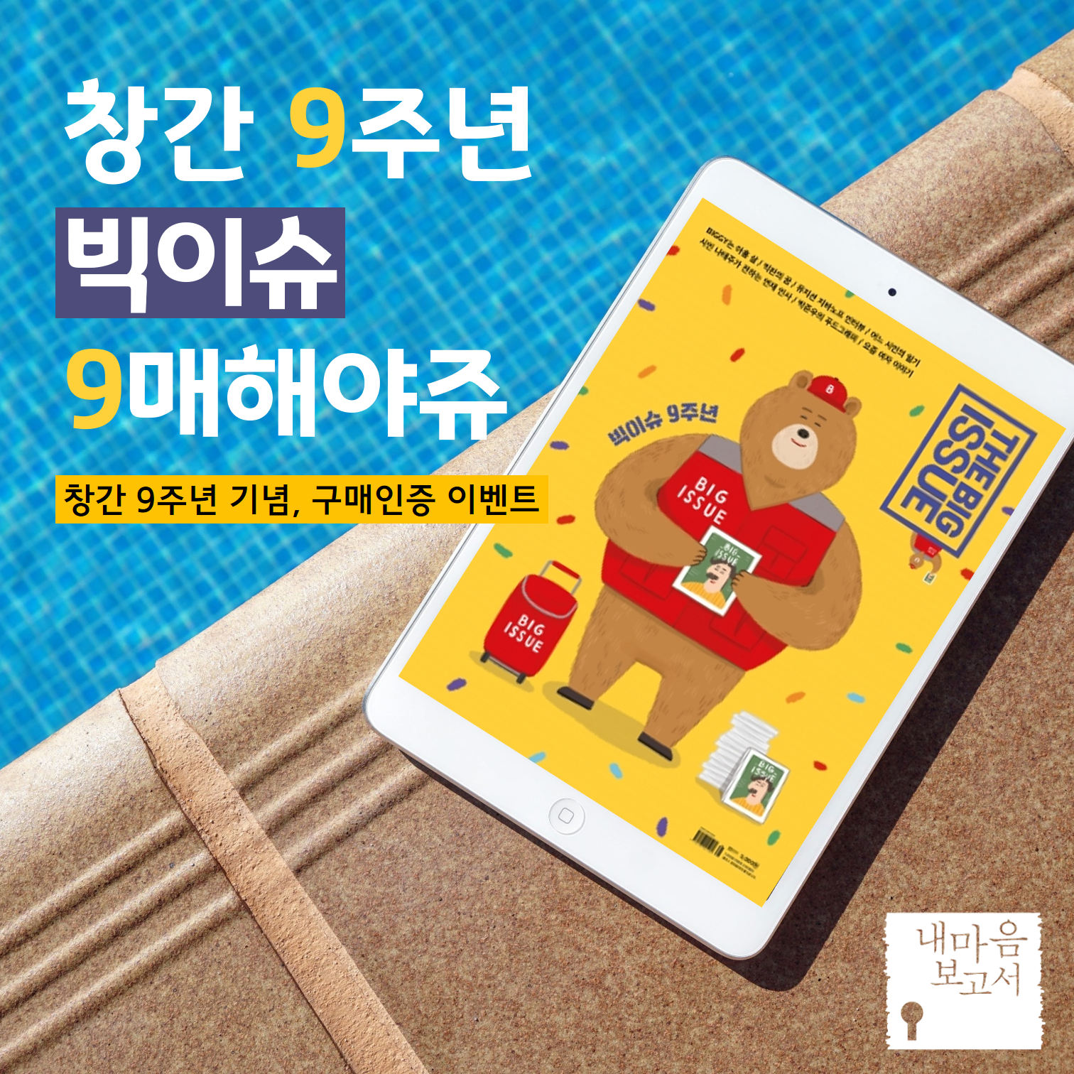 최근 3개월 내 빅이슈 구매인증샷(No.202 어쩐지 낯선, 이동휘 / No.203 데이비드 호크니 / No.204 봉준호X송강호, 칸을 사로잡다 / No.205 흔들리지 않고, 지창욱답게 / No.206 SPIDER-MAN: FAR FROM HOME / No.207 빅이슈 9주년)을 마인드프리즘 SNS(메시지)로 보내주시면, <내마음보고서> 만원 할인권을 보내드립니다.