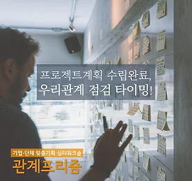 [기업·단체 맞춤기획 심리워크숍] 프로젝트 계획 수립 완료, 우리 관계 점검 타이밍! 프로젝트계획이 수립되는 쯤인가요? 시작하는 3월, 함께하는 우리 그리고 그 안의 나는 어느정도 준비되어있나요? 삐걱댈까봐 걱정된다면, 시작 전 함께 숨고르기가 필요하다면? 팀빌딩이 필요한 우리! 마인드프리즘과 함께 '우리', 그리고 그 속의 '나'를 살펴보는 시간을 가져보세요. ─ 은 '우리안의 나'를 살피는 성찰의 시간을 통한 조직원들의 관계 치유와 화합을 목표로, 조직문화와 조직의 고민, 목적을 고려하여 맞춤형으로 기획됩니다. ㆍ기업/단체 소개서 신청 바로가기 >> https://bit.ly/2BJldb0 ㆍ마인드프리즘 홈페이지 >> www.mindprism.co.kr ㆍ마인드프리즘 스마트스토어 홀가분가게 >> https://smartstore.naver.com/holgaboon 더보기 이전 1 ··· 239 240 241 242 243 244 245 ··· 1128 다음