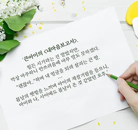 큰아이의 <내마음보고서> “큰아이의 마음보고서…큰아이가 힘든 시기라는 것을 알았지만, 눈 앞에 글자로 마주하니 안쓰러움에 아무말도 못하겠다. "괜찮아.."하며 내 얼굴을 되려 살피는 큰 딸. … 봄날의 햇볕을 느끼며 아이의 재잘거림을 들으니, ... 아이와 나, 사이에도 봄날이 온 것 같았던 오후.” 누군가는 졸업을, 누군가는 새로운 시작을 위한 준비를 하고 있을 우리 아이들. 어느새 이렇게 컸나 싶다가도 아직 남아있는 어릴 적 그 모습에 마음이 쓰이는건 어쩔 수 없나봅니다. 차고 험한 세상에 다치고 있는건 아닌지, 걱정되는 마음에 건네는 나의 한마디가 상처가 되진 않을까.. 막힌 마음 어루만져 뻥 뚫어줄 수 있다면 얼마나 좋을까요? 내마음보고서로 사랑하는 자녀와 함께 마음을 어루만지는, 따뜻한 봄날같은 시간을 가져보세요. - .. 더보기 이전 1 ··· 243 244 245 246 247 248 249 ··· 1128 다음