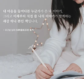 의미있고 꼭 해볼만한 도전이라고 생각해요 그 어느때보다 솔직하게 작성하려고 했고,그에 걸맞는 솔직한 책을 받아볼 수 있었습니다. 왜 그렇게 누군가에게 상처를 받아왔었는지,왜 그렇게 누군가를 의도치 않게 힘들게 만들었었는지.책을 통해 조금이나마 알 수 있었습니다. 의 절반은 이미 누군가에 의해 쓰여진 나의 이야기,그리고 절반은 이제 쓰여질 나의 이야기. 가을이 가기 전에 펜을 집어들까 합니다. 나 스스로를 직면하는 일은 불편하고 두려운 일이기도 합니다.하지만 그 과정 속에 그만한 의미가 있다고,더 늦기 전에 꼭 해볼만한 도전이라고 말하고 싶습니다. - 오구삼 님의 후기 * 내마음보고서가 궁금하다면? www.mindprism.co.kr/Report 더보기 이전 1 ··· 290 291 292 293 294 295 296 ··· 1128 다음
