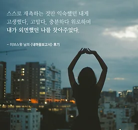 내가 외면했던 나를 찾아준 내마음보고서 유난히 나를 파고드는 심리검사 질문들에 평소에 느끼지 못했던 나약한 내 모습이 느껴졌다.싱숭생숭한 기분으로 검사를 마치고,기다리는 2주의 시간동안 어찌나 초조하던지 ... 하지만 막상 접한 결과는 처음부터 끝까지 그저 '나'였다. 두루뭉술하던 나를 페이지에 또렷하게 새겨진 '나'로 만나는 게 어색했다.두근거리고 설레는 마음으로 마지막에 다다랐을 때나를 위한 선물, 한 편의 시로 놀란 마음을 위로 받기도 했다. 는 분석하고 방향을 재촉하는데 익숙한 내게,내가 외면했던 나를 먼저 찾아주고고생했다, 고맙다, 충분하다, 당연하다 위로해주었다. 나 자신에게 이런 위로가 필요했구나,어쩌면 나 스스로를 이렇게 위로해줄 수 있겠구나, 그렇게 경험을 통해 어렴풋이 느낄 수 있었다. - 이브스윗 님의 후기 * 내마음보고서.. 더보기 이전 1 ··· 293 294 295 296 297 298 299 ··· 1128 다음
