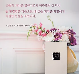 늘 한결같이 내 곁을 지켜준 사람에게 보내는 선물 10월의 차가운 밤공기조차도 따뜻했던 첫만남이었습니다. 서로를 알아가는데 많은 시행착오도 있었지만, 늘 한결같은 마음으로 서로의 곁을 든든히 지켜줬어요. 새로운 도전을 앞두고 있는 그 사람에게 특별한 선물을 전하고 싶어 '내마음보고서'를 보내고자 합니다. 새로운 도전 앞에 스스로를 잘 다독일 수 있길, 또 우리 서로가 조금 더 이해할 수 있는 계기가 될 수 있길 바랍니다. '승쿤' 님의 후기 _ *가 궁금하다면 >> www.mindprism.co.kr/report 더보기 이전 1 ··· 330 331 332 333 334 335 336 ··· 1128 다음