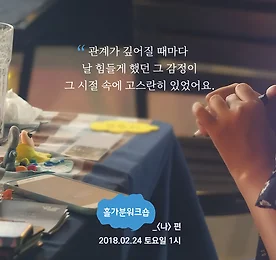 '어린 나'를 통해 다시 만나는 '지금의 나' 어린 내가 했던 아주 평범한 행동들 속에, 내가 상처를 극복하고자 선택했던 행동과 말들이 고스란히 녹아있었어요. 그리고 어렴풋이 느껴지기 시작했어요. "내가 괜찮다고 생각했던 건 하나도 괜찮지 않았던 거구나." 지금까지 관계 속에서 날 힘들게 만들었던 감정들이 그 시절에도 고스란히 녹아 있었어요. 을 통해 나눈 그 모든 이야기들. 이야기를 나눌수록 만나고 싶은 사람들의 얼굴도 떠올랐어요. 내 마음을 꼭 알아줬으면 하는 사람들이 말이에요. 다섯 시간이 짧게 느껴졌어요. 아주 많은 에너지기 필요했지만, 그 어느 때보다 평점심을 되찾은 기분을 느꼈습니다. -편 참가자 후기 *2018년 2월 24일 홀가분워크숍-나>> https://goo.gl/uo16wF 더보기 이전 1 ··· 348 349 350 351 352 353 354 ··· 1128 다음