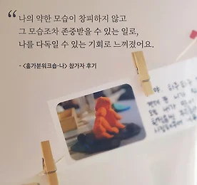 홀가분워크숍-나 2018.02.24 "그 어느 때보다 솔직한 내 모습을 만날 수 있었어요. 그리고 그 누구보다 내 마음을 가장 최우선으로 배려하는 프로그램이었습니다. 나의 약함을 말하는 일이 창피하지 않고 충분히 존중받을 수 있는 일로서, 나를 다독일 수 있는 기회로 주어져서 홀가분하다는 느낌을 받았어요." - 참가자 후기 *2018년 2월 24일 홀가분워크숍-나>> https://goo.gl/uo16wF 더보기 이전 1 ··· 351 352 353 354 355 356 357 ··· 1128 다음