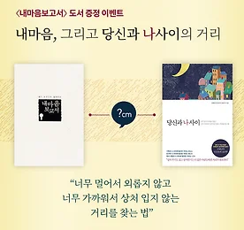 도서 증정 이벤트, 당신과 나 사이 [내마음보고서 신간도서 증정 이벤트 : 당신과 나 사이] 2월 8일부터 19일까지 를 정가구매 하신 후 심리검사까지 마치신 분들께 를 보내드립니다. (기간내 선착순 한정수량, 와 함께 동봉배송됩니다) - 베스트셀러 의 저자 김혜남이 10년 만에 펴낸 인간관계 심리학 를 소개합니다. '가족과 나 사이 20cm’, ‘친구와 나 사이 46cm’, ‘회사 사람과 나 사이 1.2m’로 관계의 유형을 소개하며 해법을 제안하는 와 함께 ‘오직 내 마음만 담은 개인맞춤형 심리보고서’로‘내 마음과 나를 둘러싼 관계’를 찬찬히 만나보세요. _내마음보고서 구매하고 '당신과 나 사이' 받기 >> www.mindprism.co.kr/Report 더보기 이전 1 ··· 353 354 355 356 357 358 359 ··· 1128 다음