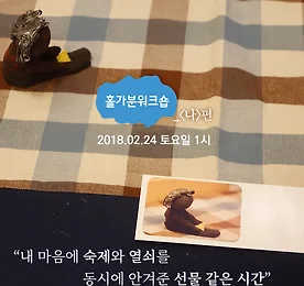 과제와 함께 열쇠를 안겨준 선물 같은 시간 "홀가분워크숍은 '나를 향해 내딛는 첫걸음'이다. 자연스럽게 거부감 없이 나를 돌아볼 수 있는 첫걸음 같은 프로그램이었다." "과제와 함께 열쇠를 안겨준 선물 같은 시간. 고마워요." "내 안을 들여다보는 거울이다. 나도 모르던 내 감정과 민낯을 마주한 느낌." "마음과 마음이 만나는 시간이다. 정말 사람과 사람이 연결된다는 느낌을 받는다." "'나'라는 내가 알지 못하는 미지의 세계를 탐구하는 시간." - 참가자 후기 *2018년 2월 24일 홀가분워크숍-나>> https://goo.gl/uo16wF 더보기 이전 1 ··· 358 359 360 361 362 363 364 ··· 1128 다음