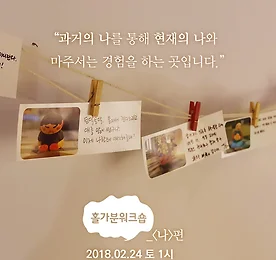 2018년 첫 번째 홀가분워크숍-나 "홀가분워크숍은 마시멜로다. 왜냐하면 함께하는 동안 마음이 말랑말랑해지기 때문이다." "내마음 설명서를 받는 워크숍. 내 마음과 감정의 원인을 파악하고 더 잘 이해할 수 있기 때문이다." "과거의 나를 통해 현재의 나와 마주서는 경험을 하는 곳. 왜냐하면 과거의 한 사건, 시점 등을 통해 현재의 연관성, 연결성 등을 찾게 되고 나를 이해하게 되기 때문이다." -2017 참가자 후기 *2018년 2월 24일 홀가분워크숍-나>> https://goo.gl/uo16wF 더보기 이전 1 ··· 361 362 363 364 365 366 367 ··· 1128 다음