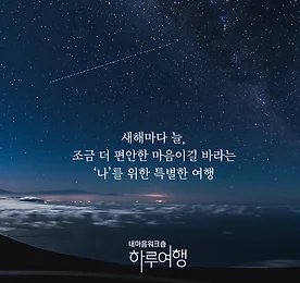 새해마다 늘 편안한 마음을 바라는 나를 위한 여행 *2018 첫 내마음하루여행 얼리버드 세일 중 (~12.31까지) >> https://goo.gl/e1UR3c 패키지 특별할인 >> https://goo.gl/EXV2EJ 새해가 올 때마다 늘 "올해는 편안한 마음으로 지낼 수 있기만을" 바라는 나를 위한 특별한 여행. 바쁜 나날 속에서 때로는 너무 당연히 다음 순위로 미뤄뒀던 내 마음, 은 그런 내 마음을 깊게 들여다보고 따뜻하게 토닥여볼 거예요. 새해 새 출발이 벅차지 않도록, 내 마음부터 따뜻하게 채우는 시간입니다. 더보기 이전 1 ··· 378 379 380 381 382 383 384 ··· 1128 다음
