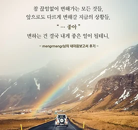 내 마음이 내린 선택과 변화를 알고 있다는 것 그때 읽었던 것과 또 다르게 다가오는 내마음보고서 속 새로운 글귀들. 나의 심리코드가 담고있는 나의 모습과 무관하지 않았던 지난 일들과 현재 나의 주변 상황들. 내가 관심을 갖는 어떤 일. 조금 신중해지는 어떤 일. 그러고 보면 참 끊임없이 변해가는 모든 것들. 또 지금과 다르게 다시 변해갈 어떤 상황들. 좋다. 좋아. 별 특별한 좋은 느낌도 없이 나는 좋다라고 말하지만, 변하는 건 늘 좋은거야. 결국엔 내게 좋은 일이 될테니. 살짝 조금은 기대하며 나도 길을 모르는 나의 미로 속에서 또 무언가의 변화를 지켜봐야지. 좋아.좋아.좋아. -mengrmengr님의 내마음보고서 후기- 나의 심리코드를 담은 내마음보고서 만나러 가기 >> http://www.mindprism.co.kr/report 후기 더 보러가.. 더보기 이전 1 ··· 403 404 405 406 407 408 409 ··· 1128 다음