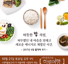 따뜻한 밥처럼, 하무했던 내 마음을 달래는 시간 올해 4월, 에 참가했던 분들의 소감은 어떨까요? - 내 이야기를 하기 위해 꺼낸 용기만큼 홀가분함을 얻을 수 있는 시간. - 높은 산을 오를 때 필요한 가이드처럼, 전문적인 도움을 받아 여행한 기분. - 시작과 끝의 느낌이 다르다. 이때까지 믿었던 나의 또다른 모습을 만났다. - 위로와 공감 속에서 서로를 도닥이는 동시에 나를 도닥여주는 시간이었다. 그리고 가 궁금하다면? 내마음워크숍-하루여행, 10월21일 >> https://goo.gl/RG285j 이번 주말에만 반짝 열리는 할인 이벤트 >> https://goo.gl/ctM83Z 내마음보고서가 궁금하다면 >> www.mindprism.co.kr/report #마인드프리즘 #내마음보고서 #내마음워크숍 #하루여행 #내마음여행 #또다른내모습 #허전한마음.. 더보기 이전 1 ··· 405 406 407 408 409 410 411 ··· 1128 다음