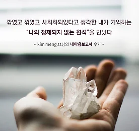 나에게 힘이 되는 '나의 원석'을 발견한 경험 나에게 힘이 되는 '나의 원석'을 발견한 경험. 나에게 쓰나미처럼 순차적으로 벌어졌던 일들을 생각해봤을 때 오늘 다시 읽은 나의 내용이 참으로 의미심장하다. 깎였고 꺾였고 사회화되었다고 생각한 내가 기억하는 나의 정제되지 않은 원석이 아직 남아있다는 것이 지금에 와선 더욱 감사하다. 그 원석으로 지금 내 앞날을 살아보고자 하는 나이니까. -kim.meng.tt 님의 내마음보고서 후기- 후기 더 보러가기 >> https://goo.gl/f294UJ --------------------------------------------------------------- 내마음보고서 만나기 >> www.mindprism.co.kr/report 더보기 이전 1 ··· 406 407 408 409 410 411 412 ··· 1128 다음