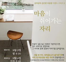 [심야심야 이벤트 2] 마음이 쉬어가는 자리 (내마음보고서 + 워크숍디렉터와의 1:1 대화) '마음이 길을 잃고 멈춰선 기분이 든다면, 잠시 쉬어가도 괜찮아요. 그 자리에 함께 멈춰서 이야기를 들어줄게요.' 내일 밤 9시, '오직 내 마음만을 위한 자리'가 홀가분가게에 '처음' 마련됩니다. 단 하룻밤 동안만 예약 가능한 마인드프리즘의 특별한 이벤트, 심야심야:깊은밤 마음밤 이벤트 시리즈 두번째, '마음이 쉬어가는 자리'. , 을 통해 많은 나들의 마음을 도닥여주었던 워크숍디렉터와 로 나누는 1:1 대화로 준비했습니다. 심리검사를 진행 후 2주 간의 분석-제작 과정을 거쳐 완성된 로 함께 이야기를 나누는 '마음이 쉬어가는 자리'. 내일 밤, 9월13일 밤9시부터 다음날 새벽 6시까지, 단 9시간의 하룻밤동안만 만날 수 있는 선착순 한정수량 이벤트입니다. 오직 나만을 위해 조용히, 나즈막히 이야기를.. 더보기 이전 1 ··· 420 421 422 423 424 425 426 ··· 1128 다음