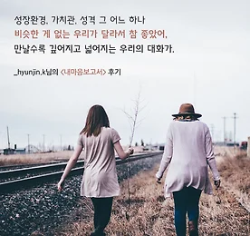 닮은 게 없는 우리가 참 좋아 서로가 서로에게 느꼈던 부분을 나누고, 함께했던 경험을 이어주고, 성장하기 위해 격려해준 소중하고 감사한 시간. 성장환경, 가치관, 성격 그 어느하나 비슷한게 없는 우리가 달라서 참 좋았던 시간들. 만나면 만날수록 깊어지고 넓어지는 우리의 대화들. 내말대로 하길 잘했지? - _hyunjin.k 님의 내마음보고서 후기 내마음보고서가 궁금하다면 >> www.mindprism.co.kr 친구와 함께하면 더 좋은 공동구매 할인 >> https://goo.gl/jBBSFq 후기 더 보러가기 >> https://goo.gl/dyQnD3 더보기 이전 1 ··· 425 426 427 428 429 430 431 ··· 1128 다음