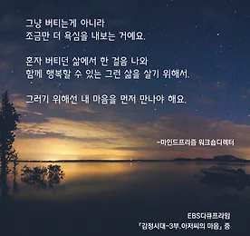 버티는 삶이 아니라, 조금 더 행복해지기 위해서 질문: 사실 내가 괜찮은 사람이라는 것을 느끼기 위해서, 그 이유 하나만으로 우리가 내마음을 만나봐야 하는 건 아닐 거 같아요. 그건 수많은 이유들 중 한 가지 아닐까요? 김미성 디렉터: ... 살아야 하니까 내마음을 봐야 된다고 생각하면 좋겠어요. 그냥 버티는 게 아니라 좀 더 욕심을 내는 거예요. 혼자 버티던 삶에서 한걸음 나와, 이제부턴 함께 행복할 수 있는 그런 삶을 살기 위해서. EBS다큐프라임 중 김미성 디렉터 인터뷰 홀가분워크숍-나 예약하러 가기>>https://goo.gl/r3vSRv EBS다큐프라임 인터뷰 보러가기>>https://goo.gl/RQdgsF 더보기 이전 1 ··· 440 441 442 443 444 445 446 ··· 1128 다음