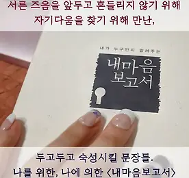 건강한 자존감향상을 위한, 세상 유일한 나만을 위한 책 서른 즈음을 앞두고 - 흔들리지 않기 위해, 방황하며 아까운 시간을 흘려보내지 않기 위해 자기다움을 찾기 위해. 알게 된 - 내가 누구인지 알려주는 내마음보고서 ... 심리 치료도 한번 방문해본 적이 있지만 - 검사를 제외하곤 거의 심리상담 같은 느낌이라 나는 그보다 두고두고 숙성시킬만한 '문장'의 형태를 원했다. (심리상담비보다 훨씬 저렴함.) 스스로 생각해보고 주변의 말을 들어도 이름을 불러주었을 때 그제야 꽃이 되는 것처럼 - 보고서(책)는 나한테 딱 맞는 형태랄까.. 취업을 준비하는 학생들, 직장이 무료한 직장인들 - 부모님까지도 - 나는 적극 추천하고 싶다. 잊을만할 때 두고두고 볼 수 있으니까. 그때 그 시절 나의 심리상태를 사진으로, 기록으로 저장해둔 앨범 같다. >> http://cafe... 더보기 이전 1 ··· 487 488 489 490 491 492 493 ··· 1128 다음