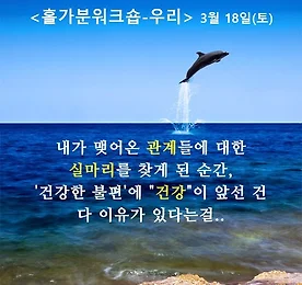 <홀가분워크숍-우리> 3월 18일(토) 예약접수 중 나는 어떤 사람인가, "우리" 안의 나는 어떤 모습인가, 차근차근 조심스럽게 내가 맺는 관계들에 대해 되새겨보는 시간. 디렉터의 이야기를 들으며 제일 먼저 떠올린 사람들에 대한 이야기를 적고, 같은 조에 있는 사람들이 전하는 이야기도 들은 뒤, 미처 떠올리지 못했다가 뒤늦게 생각해 낸 이들까지.. 저마다 우리 주변의 사람들을 생각합니다. 워크숍을 마치고, 나에게 전하는 메시지를 적어 보드에 붙였습니다. 내가 이제까지 맺어온 관계들에 대한 실마리를 찾게 된 순간, 건강한 불편이란 말의 순서에 "건강"이 앞선 것은 다 마땅한 이유가 있기 때문이겠지요. _ "우리"의 시작은 "나"로부터! 8/27 편 후기 ------------------------ ※ 2017년 첫 편은 3월 18일 토요일에 진행됩니다. 이.. 더보기 이전 1 ··· 499 500 501 502 503 504 505 ··· 1128 다음