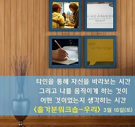 오늘 이시간은 저를 위한 선물이에요 타인을 통해 자신을 바라봅니다. 그리고 나를 움직이게 하는 것이 어떤 것이었는지 생각하기 시작합니다. 느끼기 시작합니다. 나의 관계를 돌아봅니다.... 내가 왜 지금의 관계 안에 놓이게 됐는지 그 원인과 마주하게 됩니다. 다른 이의 시선으로 내 시선을 넓혀보며 복잡한 표정으로 삼삼오오 무리지어 이야기를 나눕니다. 이야기를 듣던 눈빛이 사람을 느끼는 눈빛으로 바뀌기 시작합니다. 얼굴에 홍조를 띠기도, 깊은 눈으로 상대를 어루만져 주기도, 다가가기 힘들어 거리를 두고 주춤거리기도 합니다. "오늘 이시간은 저를 위한 선물이에요" _ 홀가분워크숍 진행자 후기 중에서.. ------------------------ ※ 2017년 첫 편은 3월 18일 토요일에 진행됩니다. 마감 임박이니, 서둘러 예약하세요 :) 상.. 더보기 이전 1 ··· 505 506 507 508 509 510 511 ··· 1128 다음
