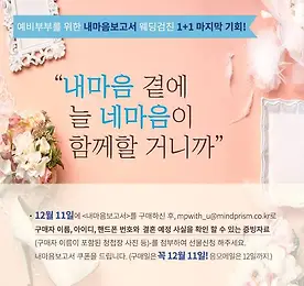 예비부부를 위한 내마음보고서 1+1의 기회 ! 예비부부인가요? 내마음보고서 1+1의 마지막 기회! 연말에 바쁘고 결혼준비로 바쁠때... 더욱 챙겨야 하는 내마음, 네마음. 우리가 나란히 함께 가기 위한 마음건강을 점검하는 시간~ 잊지마세요. 구매는 12월 11일, 응모메일은 12일까지입니다. -- 웨딩검진 1+1 참가방법 ---- 12월 11일 내마음보고서(혹은 쿠폰이나 선물권)를 1건 신규구매하신 뒤, 구매자 이름, 아이디, 핸드폰 번호와 결혼 예정 사실을 확인할 수 있는 간단한 증빙자료 (구매자 이름이 포함된 청첩장 사진 등)를 첨부하여 mpwith_u@mindprism.co.kr로 선물신청해주세요. 내 짝을 위한 '+1' 내마음보고서 쿠폰을 드립니다. 잊지마세요. 내마음보고서 구매는.. 꼭 마인드프리즘 홈페이지에서 >> http://www.mi.. 더보기 이전 1 ··· 552 553 554 555 556 557 558 ··· 1128 다음