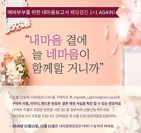 [11월11일]예비부부를 위한 웨딩검진 - 내마음보고서 1+1 [예비부부를 위한 웨딩검진 데이 - 내마음보고서 1+1 이벤트 AGAIN!] 11월 11일에 신규구매하고, 12일까지 예비부부 인증해주시면 내마음보고서 쿠폰이 하나 더 선물로~! [이벤트 응모 방법] 11월 11일에 내마음보고서(혹은 쿠폰이나 선물권)를 1건 신규구매(결제일 기준)하신 뒤, 이름, 아이디, 핸드폰 번호와 결혼 예정 사실을 확인 할 수 있는 간단한 증빙자료(구매자 이름이 포함된 청첩장 사진 등)를 메일주소(mpwith_u@mindprism.co.kr)로 보내주시면 내 짝을 위한 '+1' 내마음보고서 쿠폰을 드립니다. 구매는 11일, 이벤트 응모 메일 접수는 12일까지. 절대 놓치시면 안 돼요. 내마음보고서 "웨딩 검진 데이 이벤트"는 10월, 11월, 12월 단 세 번 11일에만 진행합니다.. 더보기 이전 1 ··· 564 565 566 567 568 569 570 ··· 1128 다음