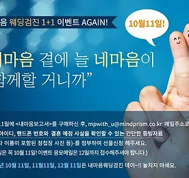 마인드프리즘(주) 사람들이 드리는 "예비부부를 위한 웨딩검진 데이-내마음보고서 1+1 이벤트!" 지난 9월, 신혼부부, 예비부부를 위한 '내마음보고서1+1' 이벤트는 정말 많은 분들이 반갑게 맞아주셨는데요. 정말 감사합니다~! 이벤트 종료 후로도 추가 진행 요청 & 문의가 끊이지 않은 덕분에 고심 끝에... 한 달에 한 번, "예비부부를 위한 웨딩 검진 데이"를 진행하기로 했습니다. 그 첫 시작은 바로 돌아오는 화요일- 10월 11일!! '1 더하기 1 = 둘'이 되기 위한 건강한 준비하는 날로 생각하도록 둘이서 나란히 마주하는 날 - 11일!! 10월 11일 단 하루 만입니다! 이날 내마음보고서(혹은 쿠폰이나 선물권)를 1건 신규구매(결제일 기준)하신 뒤,이벤트 응모 메일을 메일주소(mpwith_u@mindprism.co.kr)로 보내주시면 내 짝을 위한 '+1' 내마음보고서 쿠폰을 드립니다. 신.. 더보기 이전 1 ··· 571 572 573 574 575 576 577 ··· 1128 다음