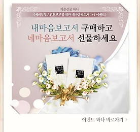 [마인드프리즘 사람들이 드리는 이벤트] 내마음보고서 1+1의 기회를 놓치지 마세요! 커플을 위한 내마음보고서 1+1 이벤트! "웨딩 검진"이라는 말 들어보셨나요?결혼 전에 건강 검진 결과를 서로에게 건네는 게 요즘 대세라는데..서로의 마음을 살피고 보듬는 시간도 역시 이 과정에서 중요한 일일 테죠.그래서 준비했습니다. 기간(9월 5일~20일) 중 를 1건 신규구매한 후,이벤트에 응모해주시면 내 짝을 위한 '+1' 내마음보고서 선물권을 드립니다.올해 결혼한 신혼부부 또는 현재 결혼 준비를 진행 중이신 예비부부를 위한 이벤트입니다. 한 사람과 한 사람이 만나 하나의 가정을 이루는 일, 그 곁에 내마음보고서가 함께하겠습니다. ▶ 이벤트 바로 가기 커플을 위한 내마음보고서 후기 이벤트! 기존에 내마음보고서를 한 번 이상 만났던 분들을 위한 이벤트도 따로 준비했습니다.커플 이벤트인 만큼, 내마음.. 더보기 이전 1 ··· 578 579 580 581 582 583 584 ··· 1128 다음