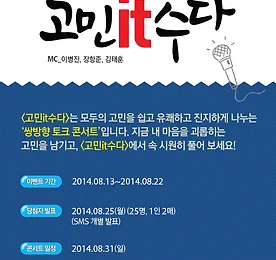 [이벤트] 힐링톡의 착한선물 릴레이 #17. 이병진, 장항준, 김태훈의 <고민it수다> 초대 이병진, 장항준, 김태훈의 착한 토크 콘서트 초대! -이벤트 기간: 2014.08.13~2014.08.22-이벤트 선물: 방관석(55,000원) 티켓: 25쌍 (1인 2매 제공) -참여 방법: 본 게시글에 비밀댓글로 이름/연락처와 함께 지금 내 마음을 괴롭히는 고민을 말해 주세요. (연락처를 적지 않을 시 당첨 선정이 불가능합니다!)-당첨자 발표: 2014.08.25 (SMS 개별연락) 착한 토크 콘서트 소개 보러 가기 답답해요? 일단 우리 만나요. 만나서 이야기해요.는 고민이 있는 사람들끼리 모여서 수다를 떨면서 자신의 고민을 털어놓기도 하고 상대방의 고민을 듣기도 하면서 서로 고민을 해결해 갈 수 있는 공연입니다. 미리 짜인 틀대로 진행되지 않고, 편하게 서로 이야기를 나누며 친구들을 만나 놀.. 더보기 이전 1 ··· 696 697 698 699 700 701 702 ··· 1128 다음