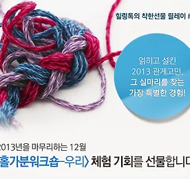 [이벤트] 힐링톡의 착한선물 릴레이 #10. 홀가분워크숍_우리 체험단을 모집합니다. 란? (클릭하기) 얽히고 설킨 관계고민, 그 실마리를 찾고 싶은 당신에게 12월 체험 기회를 선물합니다. 나는 왜 그 사람이 불편할까? 저 사람은 나의 어떤 면 때문에 그런 반응을 보이는 걸까? 에서 의미 있는 실마리를 얻어 가세요. ■ 체험단 신청 방법 1. 자신의 블로그, SNS, 온라인 커뮤니티 등에 '대인관계'에 관련된 고민과 홀가분워크숍-우리 체험단에 대한 기대평을 남깁니다. 2. 바로 이 게시글에 비밀댓글로 이름/고민과 기대평을 적은 글의 URL/전화번호/나이/집주소/이메일 을 남겨 주세요. 3. 체험단으로 선정되면, 워크숍이 끝난 후 1번의 공간에 홀가분워크숍-우리 체험 소감을 남깁니다. ■ 신청 기간 2013.11.18 (월)~2013.11.27 (수) ■ 체험단 발표 2013.11.29 .. 더보기 이전 1 ··· 856 857 858 859 860 861 862 ··· 1128 다음