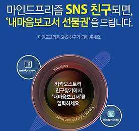 [이벤트] 마인드프리즘 SNS 친구 되기 이벤트 「마인드프리즘」SNS 친구 되면, ‘내마음보고서 선물권’을 드립니다. 마인드프리즘 SNS 친구가 되면, 카카오스토리, 페이스북, 트위터를 통해서힐링톡을 비롯한, 마인드프리즘 치유 프로그램 소식 및 이벤트 등다양한 정보를 전달 받을 수 있습니다. * 기간 : 8/30 ~ 9/8* 경품 : 내마음보고서 선물권 5명 (SNS 통해 발표) * 마인드프리즘 SNS 친구등록 방법1) 카카오스토리 : 친구찾기에서 '내마음보고서' 검색 후 ‘소식받기’ 클릭2) 페이스북 : www.facebook.com/mindprism4u 접속 후 ‘좋아요’ 클릭3) 트위터 : www.twitter.com/mindprism4u 접속 후 ‘팔로우’ 클릭 * 안내1) 카카오스토리, 페이스북, 트위터 모두 친구가 되면,이벤트 당첨될 확률이.. 더보기 이전 1 ··· 903 904 905 906 907 908 909 ··· 1128 다음